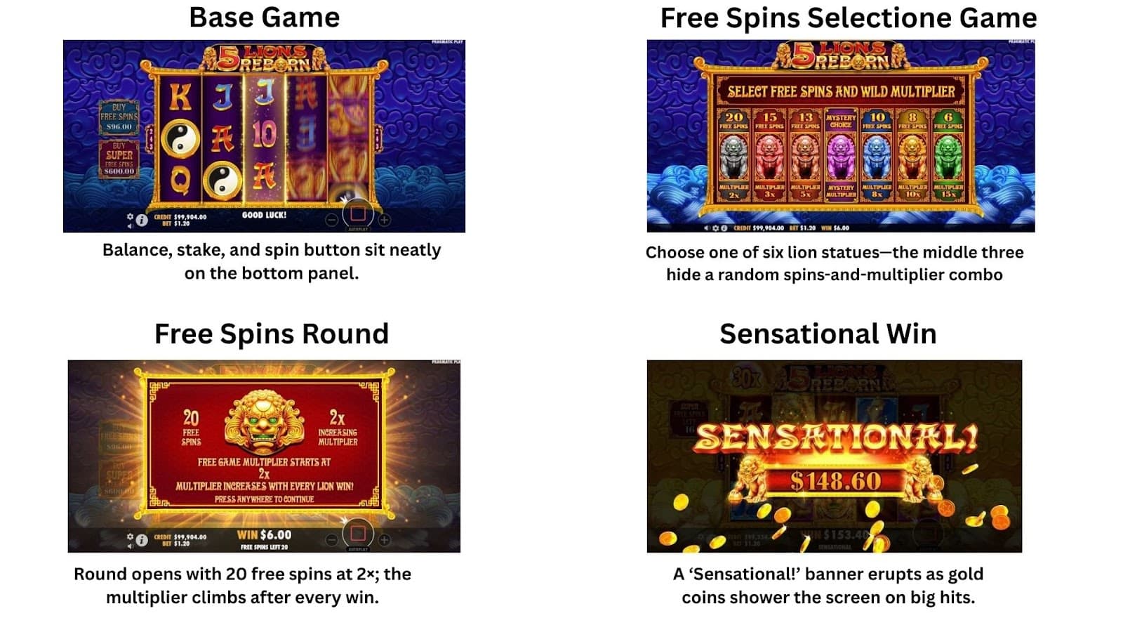5 Lions Reborn presenta gráficos ricos y detallados centrados en un telón de fondo de un templo de jade, donde los símbolos del fénix, la tortuga y el koi brillan en una ornamentada filigrana dorada. Los sutiles destellos de partículas y las ráfagas de luz añaden una sensación pulida y dinámica sin superar la estética tradicional china.